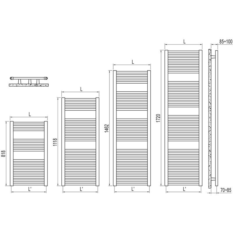 Poziome profile grzewcze mają przekrój okrągły, równy 23 mm, kolektory zaś – półokrągły, przypominający literę „D” (40 mm x 30 mm). Maksymalne ciśnienie robocze grzejnika wynosi 8 barów, a dopuszczalna temperatura pracy – 95 stopni Celsjusza.